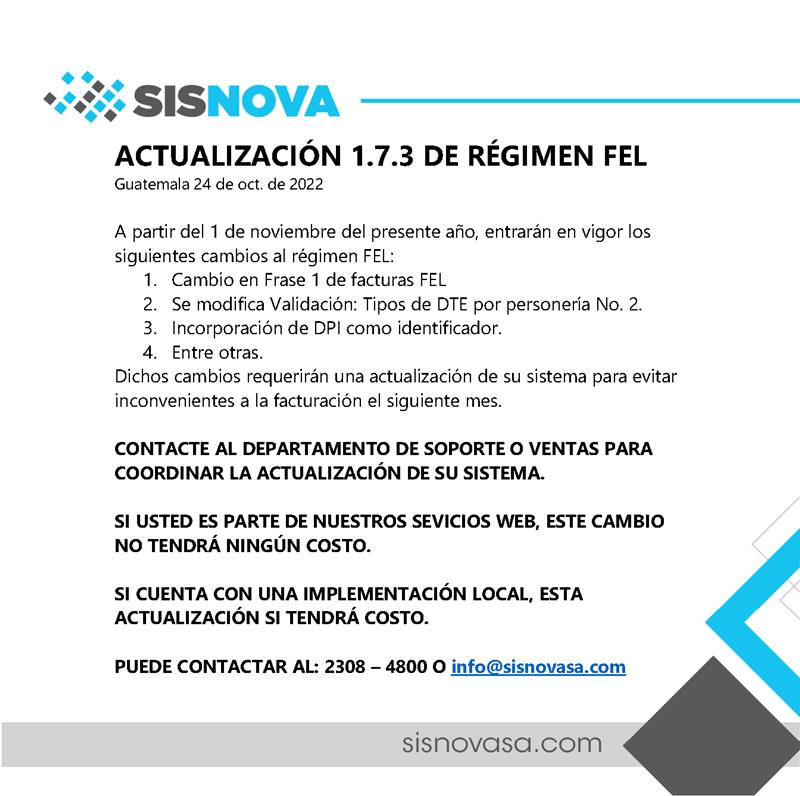 Anteriormente durante el mes de marzo del presente año SAT ha realizado un cambio que afectó a varios de nuestros clientes. Del mismo modo, este mes SAT ha enviado un comunicado para la actualización número 1.7.3 del régimen FEL. En ella se detallan los cambios en los requerimientos para la facturación electrónica de las empresas comercializadoras, que entrarán en vigor el 31 de octubre del presente año.